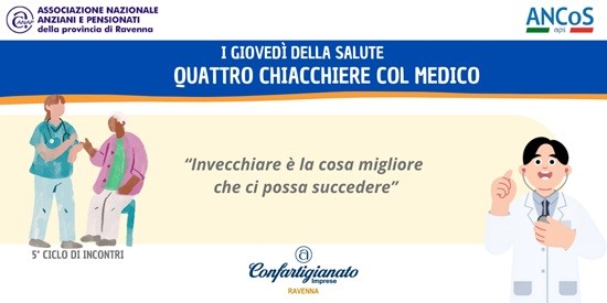 Con lo slogan ‘invecchiare è la cosa migliore che ci possa succedere’, l’Associazione Nazionale Anziani e Pensionati - ANAP della provincia di Ravenna, insieme ad Ancos, organizza il quinto ciclo di incontri ‘I giovedì della salute - quattro chiacchiere col Medico’.