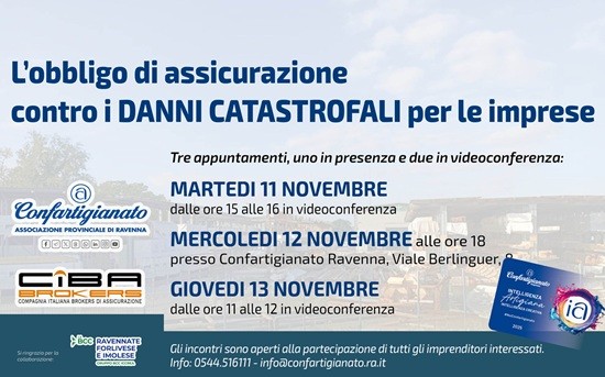 Allo scopo di approfondire i contenuti di questo norma ed offrire informazioni aggiornate ed esaustive agli imprenditori, Confartigianato della provincia di Ravenna, in collaborazione con Ciba Brokers, ha organizzato tre appuntamenti, uno in presenza e due in videoconferenza, per permettere al maggior numero possibile di associati di partecipare: