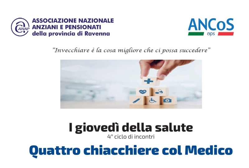Con lo slogan ‘invecchiare è la cosa migliore che ci possa succedere’, l’Associazione Nazionale Anziani e Pensionati - ANAP della provincia di Ravenna, insieme ad Ancos, organizza il quarto ciclo di incontri ‘I giovedì della salute - quattro chiacchiere col Medi...