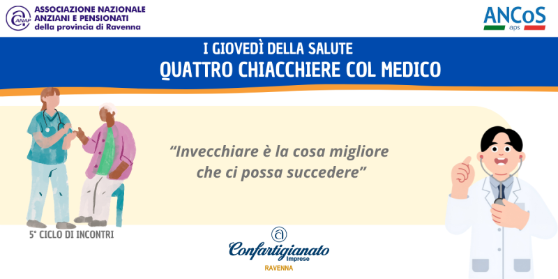 Con lo slogan ‘invecchiare è la cosa migliore che ci possa succedere’, l’Associazione Nazionale Anziani e Pensionati - ANAP, insieme ad Ancos, organizza il quinto ciclo di incontri ‘I giovedì della salute - quattro chiacchiere col Medico’...