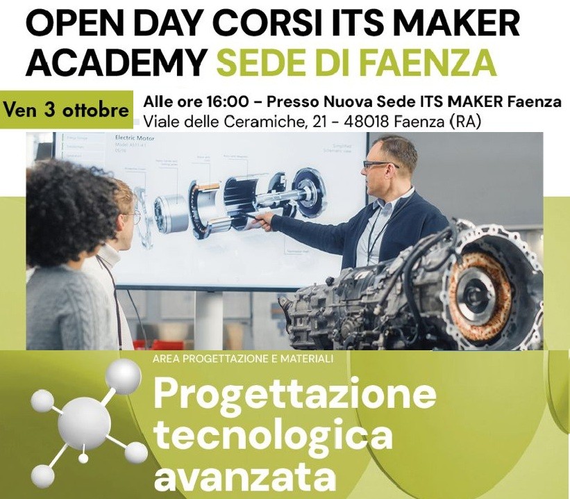 VENERDI 3 OTTOBRE 2025 dalle ore 16 alle ore 18 è previsto l'ultimo OPEN DAY di presentazione e informazione, per partecipare al quale è necessario prenotarsi (clicca QUI), presso la nuova sede Fondazione ITS MAKER in Viale delle Ceramiche 21 a Faenza.